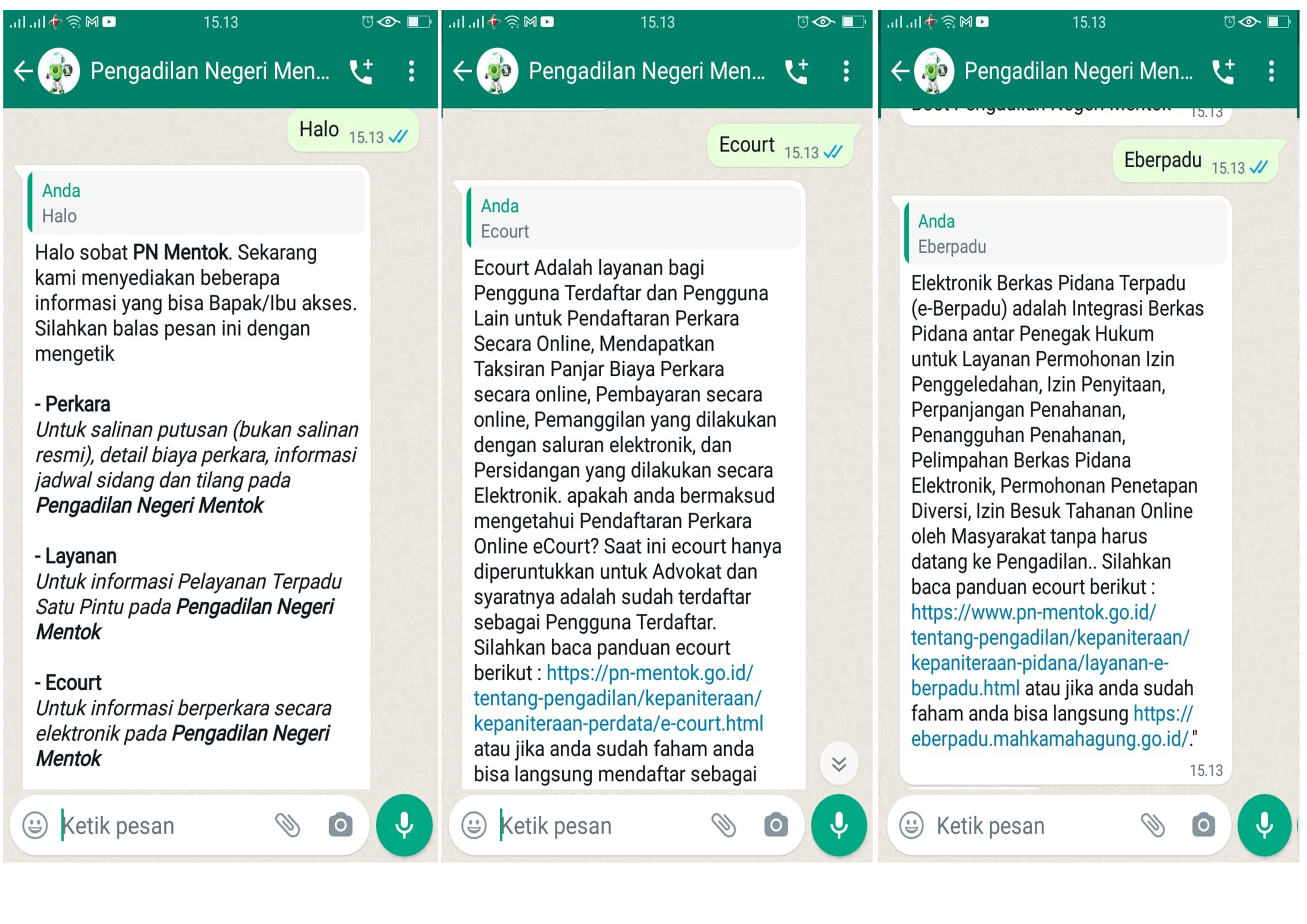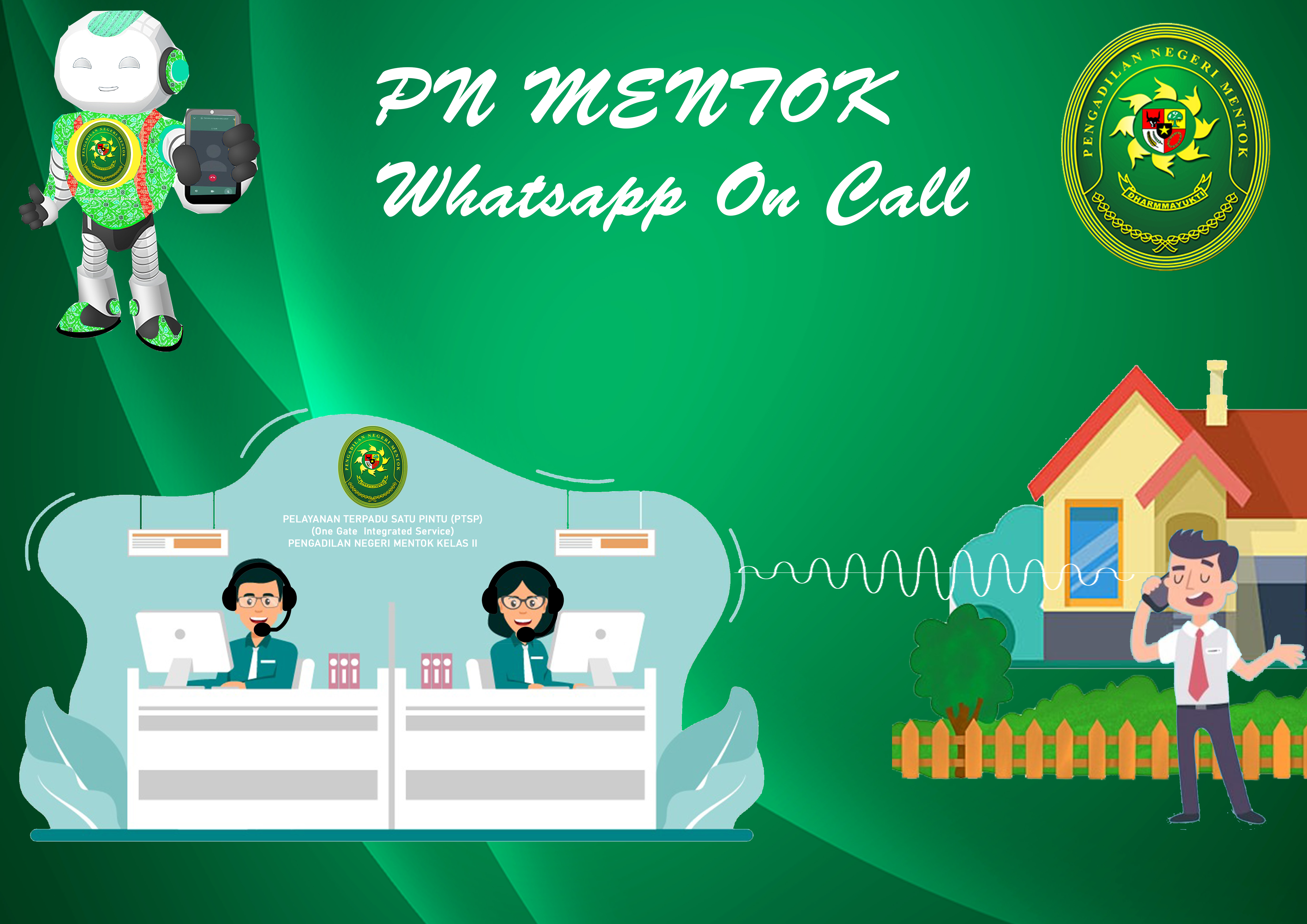 ON CALL adalah layanan daring (online) terbaru dari Pengadilan Negeri Mentok. Layanan memungkinkan anda, pencari keadilan untuk melakukan konsultasi melalui aplikasi Whatsapp dengan petugas PTSP PN Mentok. Wilayah Hukum Pengadilan Negeri Mentok yang cukup luas terkadang membuat jarak dan waktu menghalangi tujuan anda datang ke Pengadilan. Tidak usah takut, anda bisa berkonsultasi seputar Layanan di PTSP Baik itu Layanan Umum, Pidana, Perdata, Umum melalui On Call Whatsapp Bot.